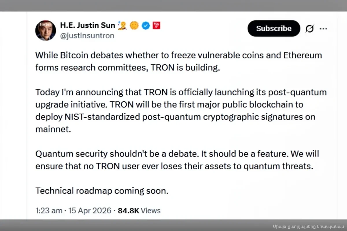Криптосообщество активно обсуждает заявление основателя TRON Джастина Сана о полной защите блокчейна от будущих квантовых атак. По слухам, активы пользователей теперь в безопасности, но официального подтверждения развертывания защиты пока нет.